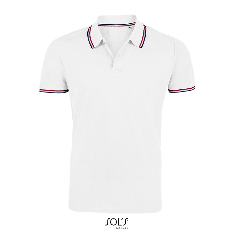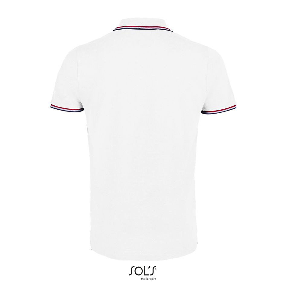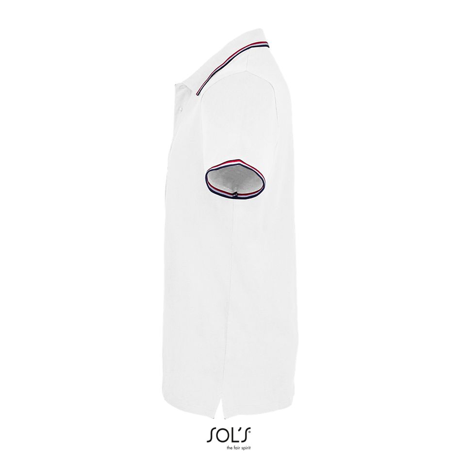 Acabado de canalé 1×1 en el cuello y en los puños – Tapacosturas tejido en el interior del cuello – Manga corta – Tapeta de 2 botones – Cortado y cosido – Rayas en contraste en el cuello, en el bajo de las mangas, en el interior de las aberturas laterales y en el interior del cuello