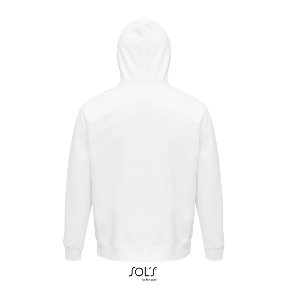Cortada y cosida – Mangas raglán – Acabado de canalé 2×2 en puños y bajos – Media luna en el interior del cuello – Tapacosturas en el interior del cuello – Cordón de ajuste con ojales y topes de metal – Capucha forrada de punto liso
